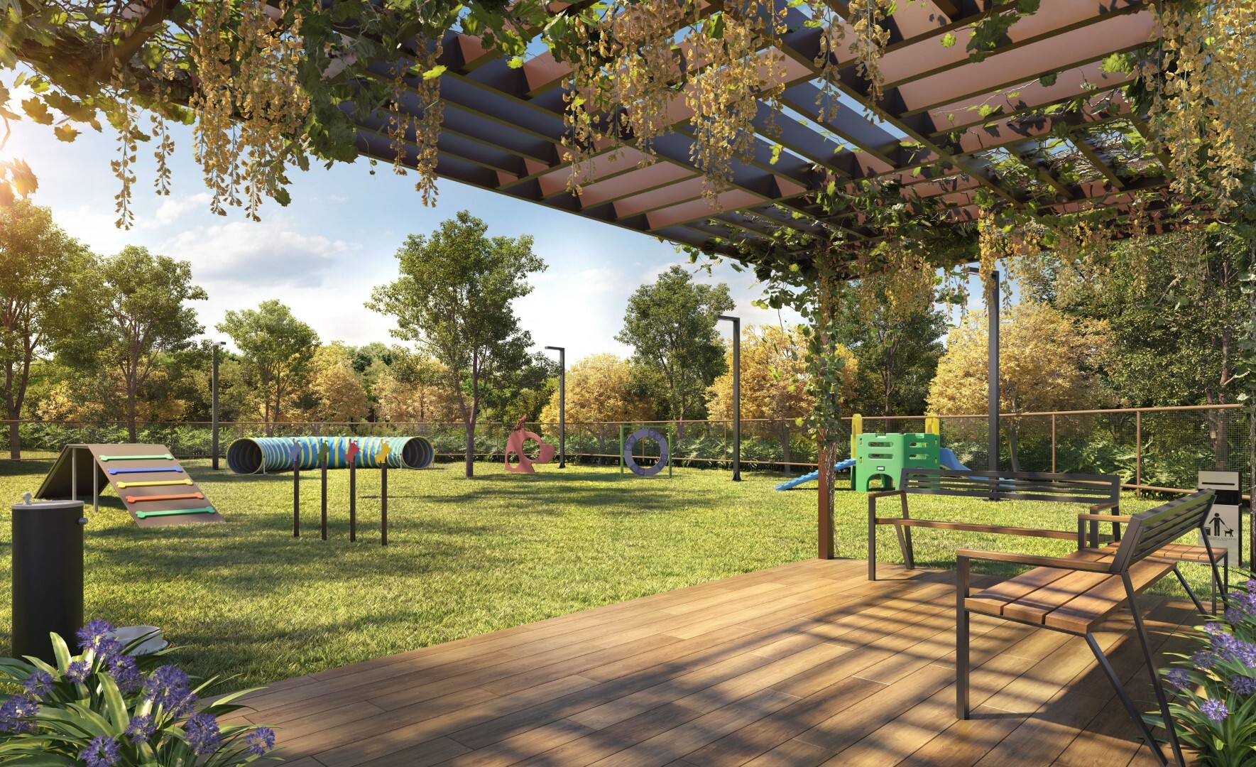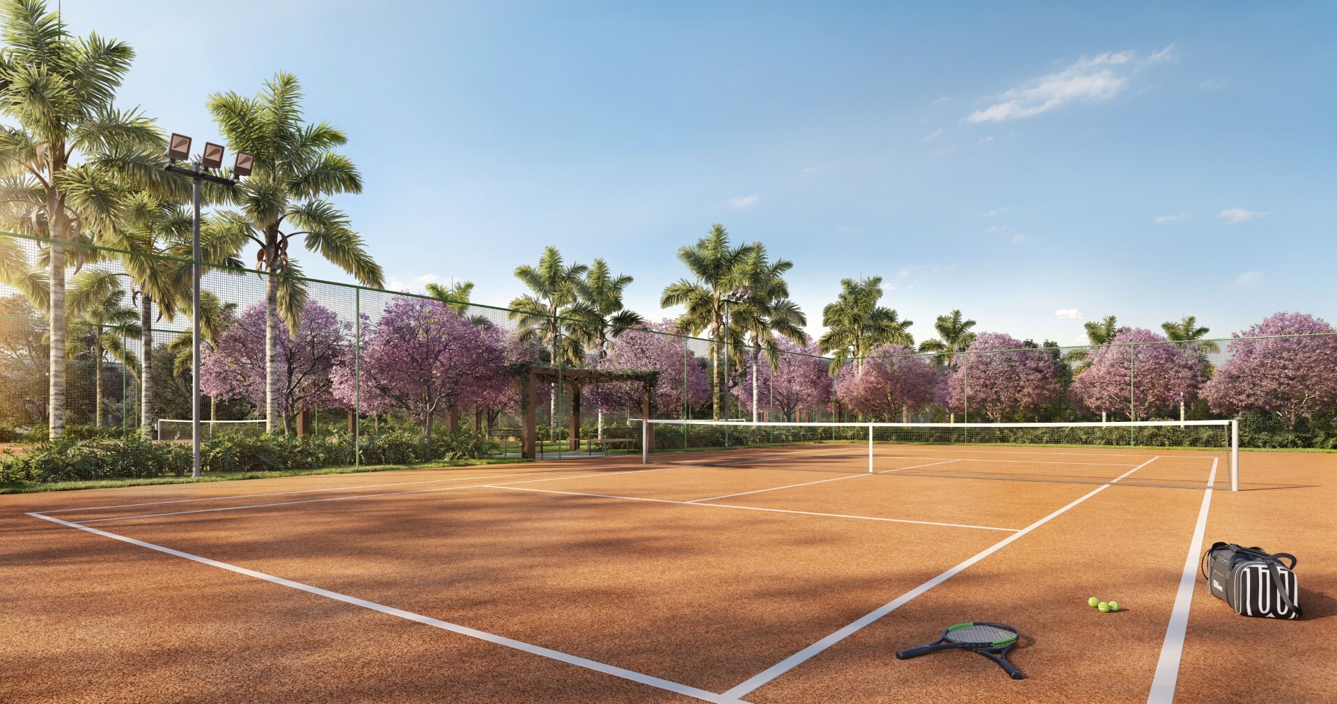 Áreas comuns com piscinas, quadra de beach tennis, playground, salão de festas, quadra de tênis, campo de futebol society, quadras de areia e fitness.